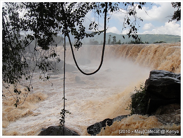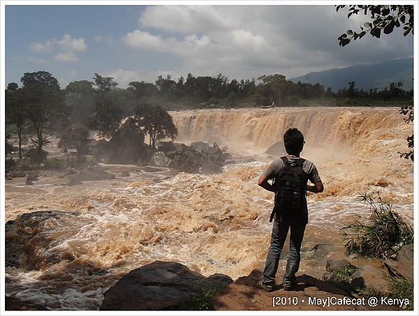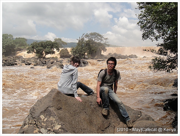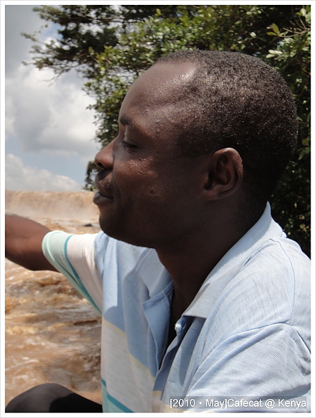 每年的四到六月是肯亞的雨季,尤其上禮拜肯亞氣候異常,連續好幾天的豪大雨,甚至許多鄉下地方還水災死了好多人。雨後的瀑布氣勢真的很壯觀,原本該是14條涓涓細流的小瀑布,全部匯集在一起變成湍急的大瀑布,打上來的水氣瀰漫整個空中,坐在旁邊石頭上,很有騰雲駕霧的fu。